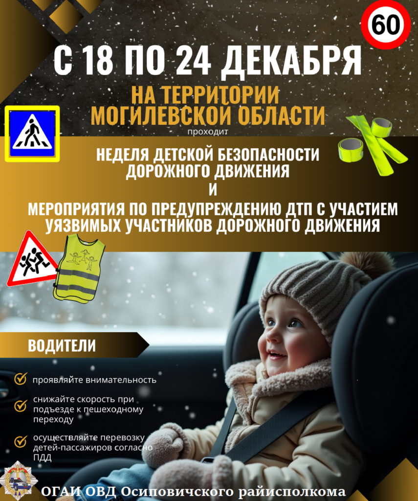 C 18 по 24 декабря на территории Могилевской области проходит Неделя детской безопасности дорожного движения, а также мероприятия по предупреждению ДТП с участием пешеходов и велосипедистов.