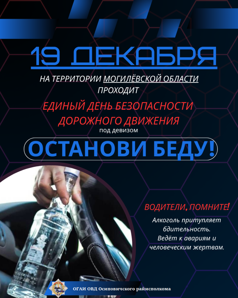«Останови беду!» – под таким названием 19 декабря 2025 года пройдет Единый день безопасности дорожного движения, посвященный профилактике ДТП, совершаемых в состоянии опьянения.